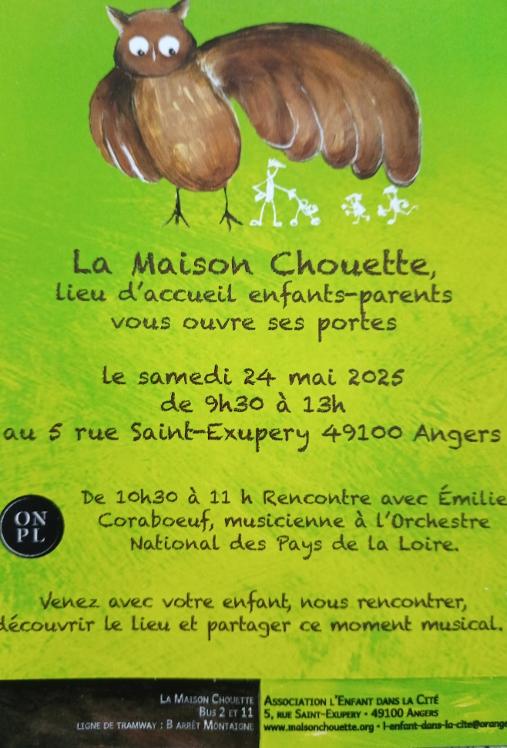 La Maison Chouette vous ouvre ses portes : Samedi 24 mai 2025 de 9h 30 à 13 h. A 10 h un musicien de l’ONPL (Orchestre National des Pays de la Loire) proposera un moment musical.